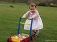 Nové fotografie zachycují Charlotte doma v Norfolku při hře na trávníku s vozíkem a kostkami. Tři další obrázky byly pořízeny v interiéru a princezna se na nich předvádí v růžovém a bílém pleteném svetříku, který se stejně jako každý kousek, který urozené batole oblékne, stane módním hitem.