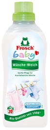 Frosch Hypoalergenní máchadlo na kojenecké a dětské prádlo nejenže prádlo změkčí, ale vypláchne i všechny zbytky pracího prostředku. Díky jemné pečující formuli nehrozí riziko podrážení jemné pokožky a doporučuje se pro citlivou kojeneckou pokožku a také alergikům. Stejně jako ostatní produkty je máchadlo výhradně z přírodních surovin, tedy veganského charakteru.