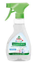 Na odolné a zaschlé flíčky, například od zeleniny, ovoce či mléka, je zde Frosch Sprej na skvrny na kojeneckém prádle. Pomocí praktického rozprašovače stačí postříkat skvrny 10 minut před praním a následně vyprat běžným způsobem.